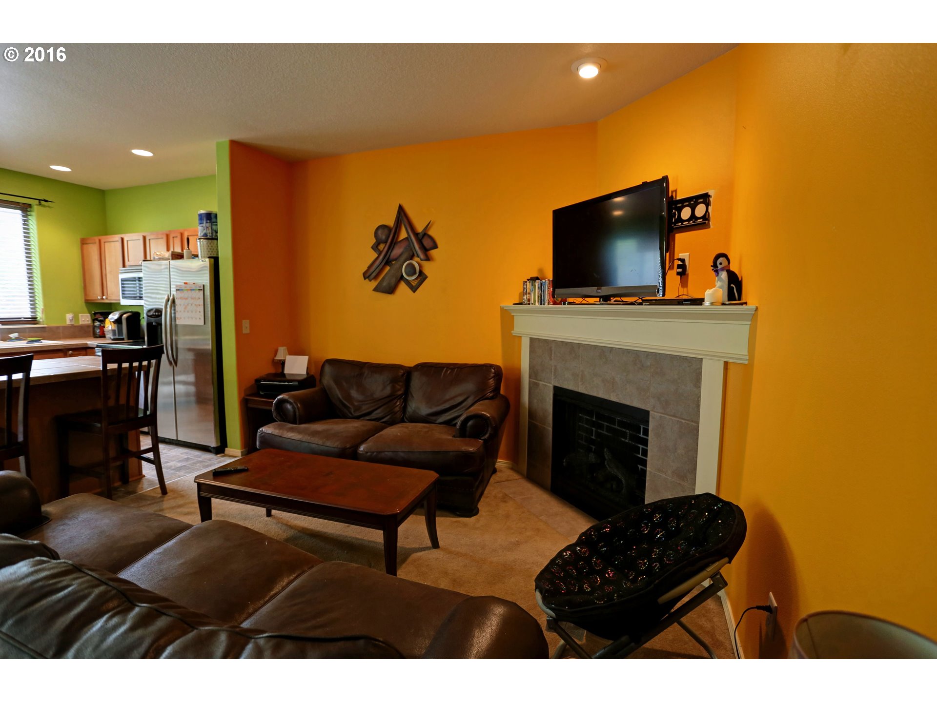 Description: Hurry this one won't last, desirable end unit! This home features a great-room floor plan w/9' ceilings, gas fireplace, 3 beds/2.5 Baths, upstairs laundry. Open kitchen features tiled counters, island, and stainless steel appliances & fridge! The large master bedroom is vaulted and includes a walk-in closet & dual sinks. Don't miss: Gas forced air heat, A/C, vaulted bedrooms, 1-car garage. Private fenced yard w/stamped concrete patio.