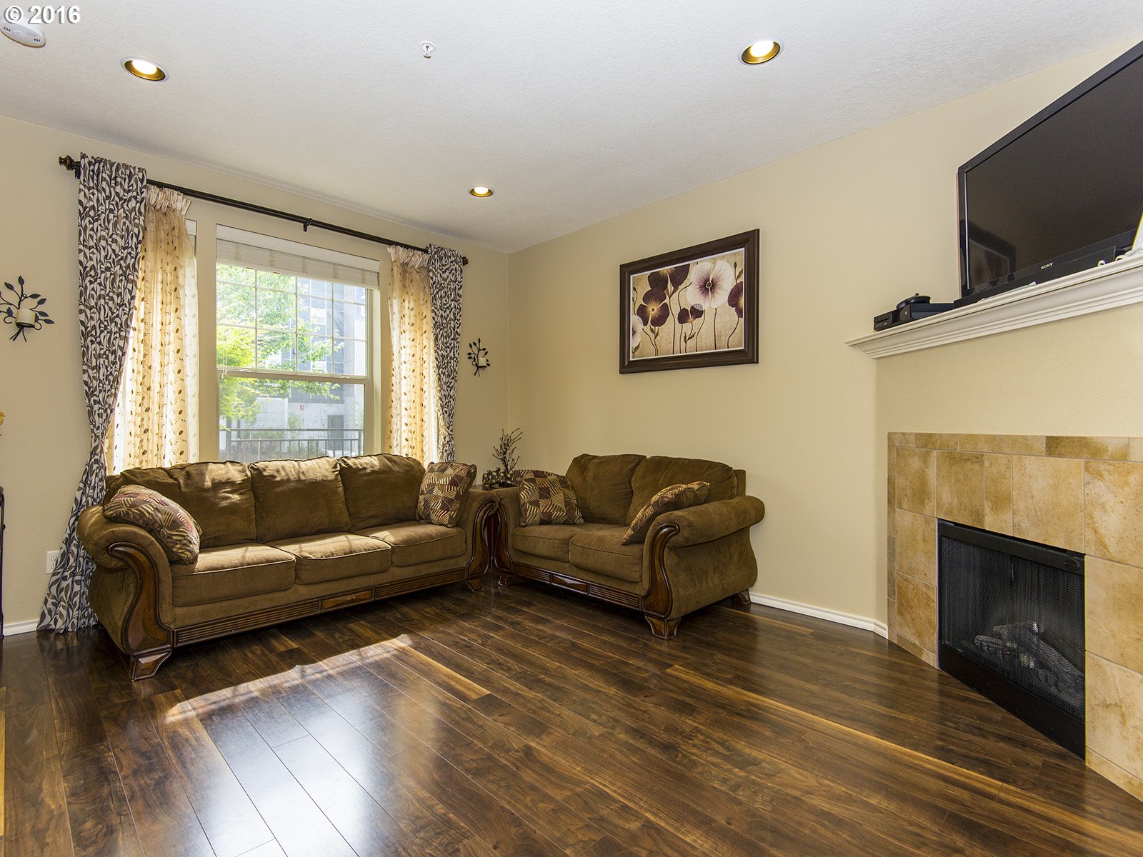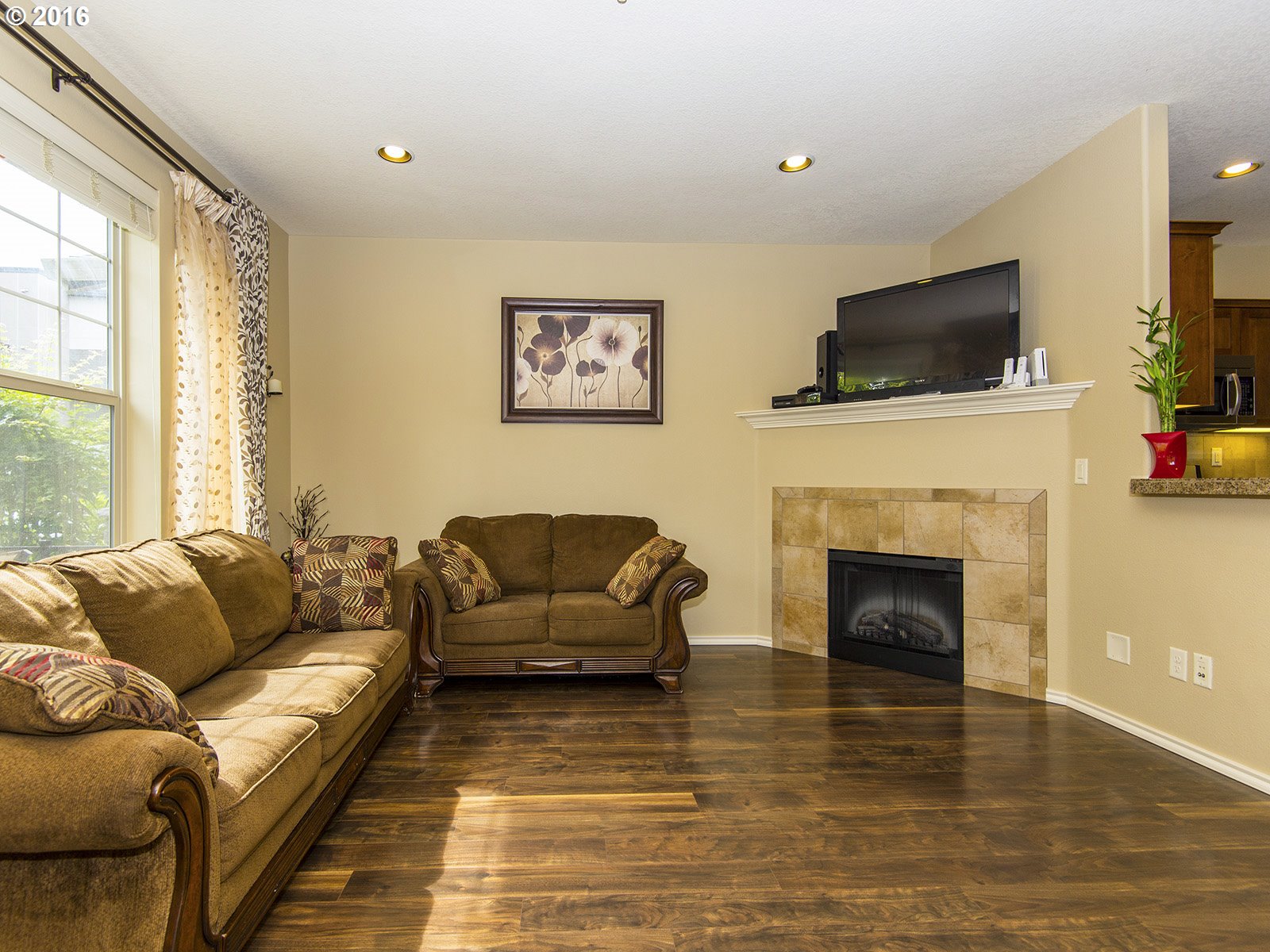 • Description: Immaculate one owner corner townhome w/designer finishes throughout. Open floor plan w/gas fireplace, upgraded laminate wood floors throughout main level & upgraded cabinets extending into dining & laundry. Gourmet kitchen w/granite bar counter, large walk in pantry, and SS gas appl. Beautiful garden and spacious courtyard w/sitting area & porch. Walking distance to coffee, shops, parks, trails. Hi speed internet included in HOA.